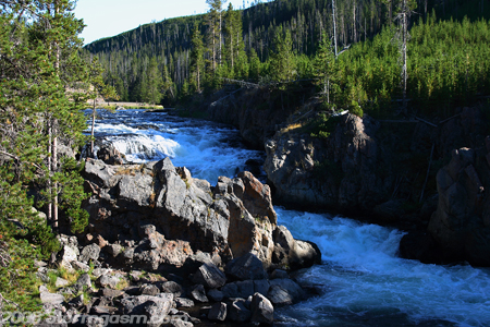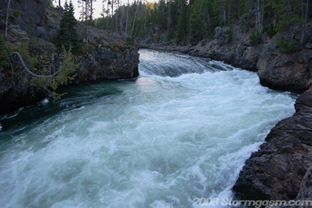 Image on the right is looking up river at the turbulant Yellowstone River before it took a plung at the Upper Falls. |
